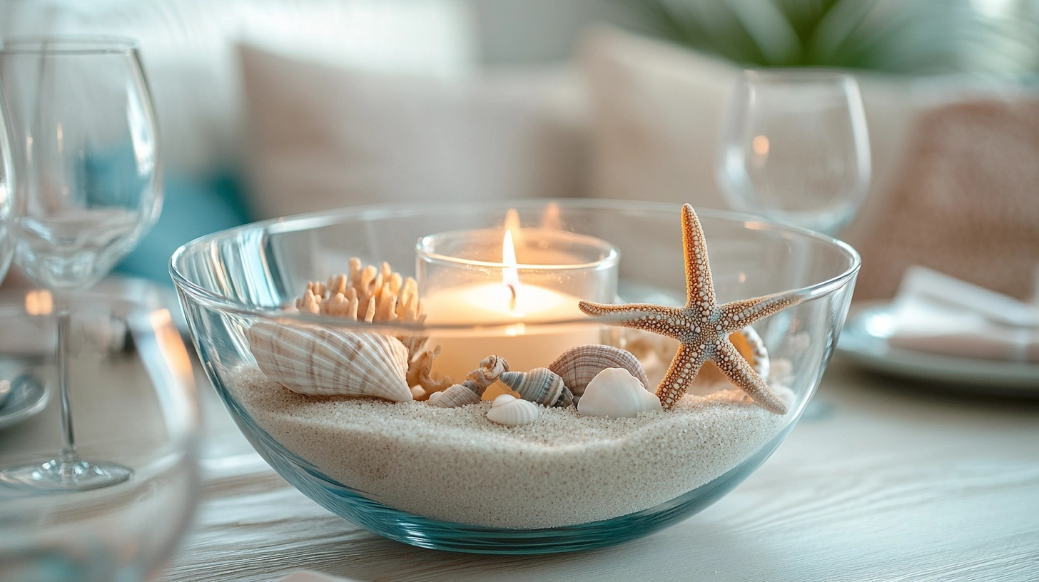 Fill a wide glass bowl with clean white sand, then layer in small seashells, coral fragments, and a starfish or two.