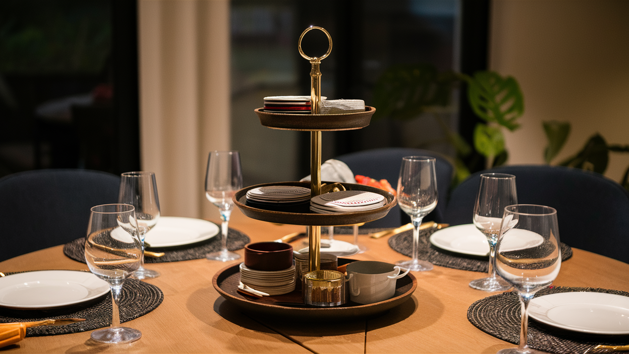 A multi-level stand brings height and interest to your table while providing storage for items you need during meals.