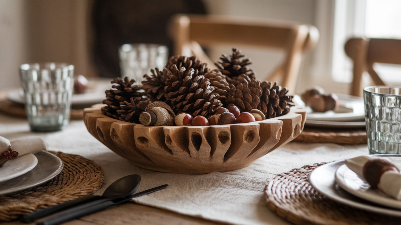 For a nature-inspired look, use a hand-carved wooden bowl as your focal point. Fill it with pinecones, acorns, or other items from the outdoors. This creates an earthy, natural centerpiece that connects your dining space to the outdoors.