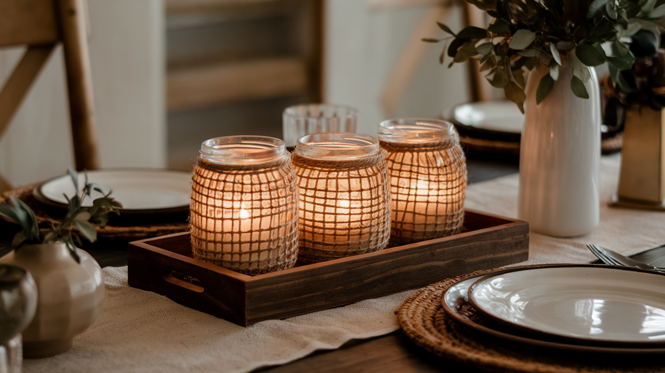 A simple wooden tray forms the perfect base for this cozy centerpiece. Place a few clear mason jars of different heights on the tray, add tea lights inside them, and wrap some natural twine around the jars for extra texture.
