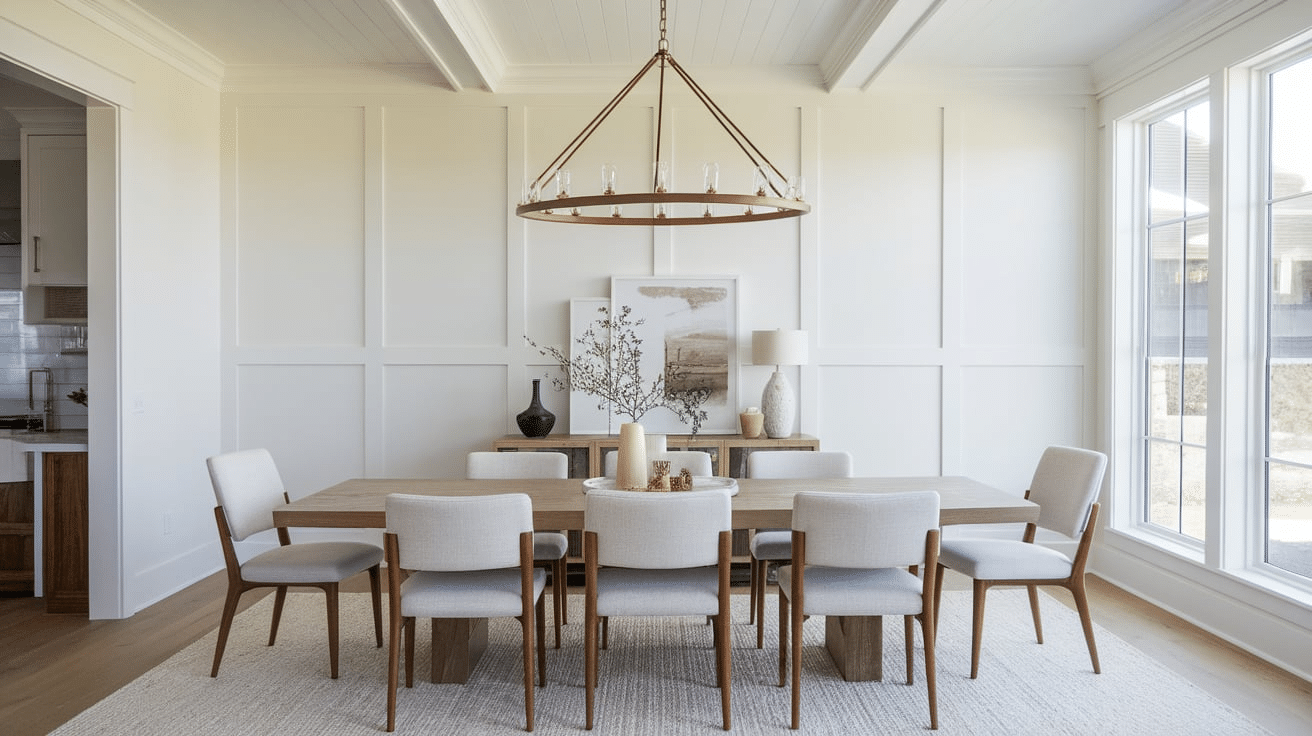 Decorative trim or wainscoting adds texture and depth.