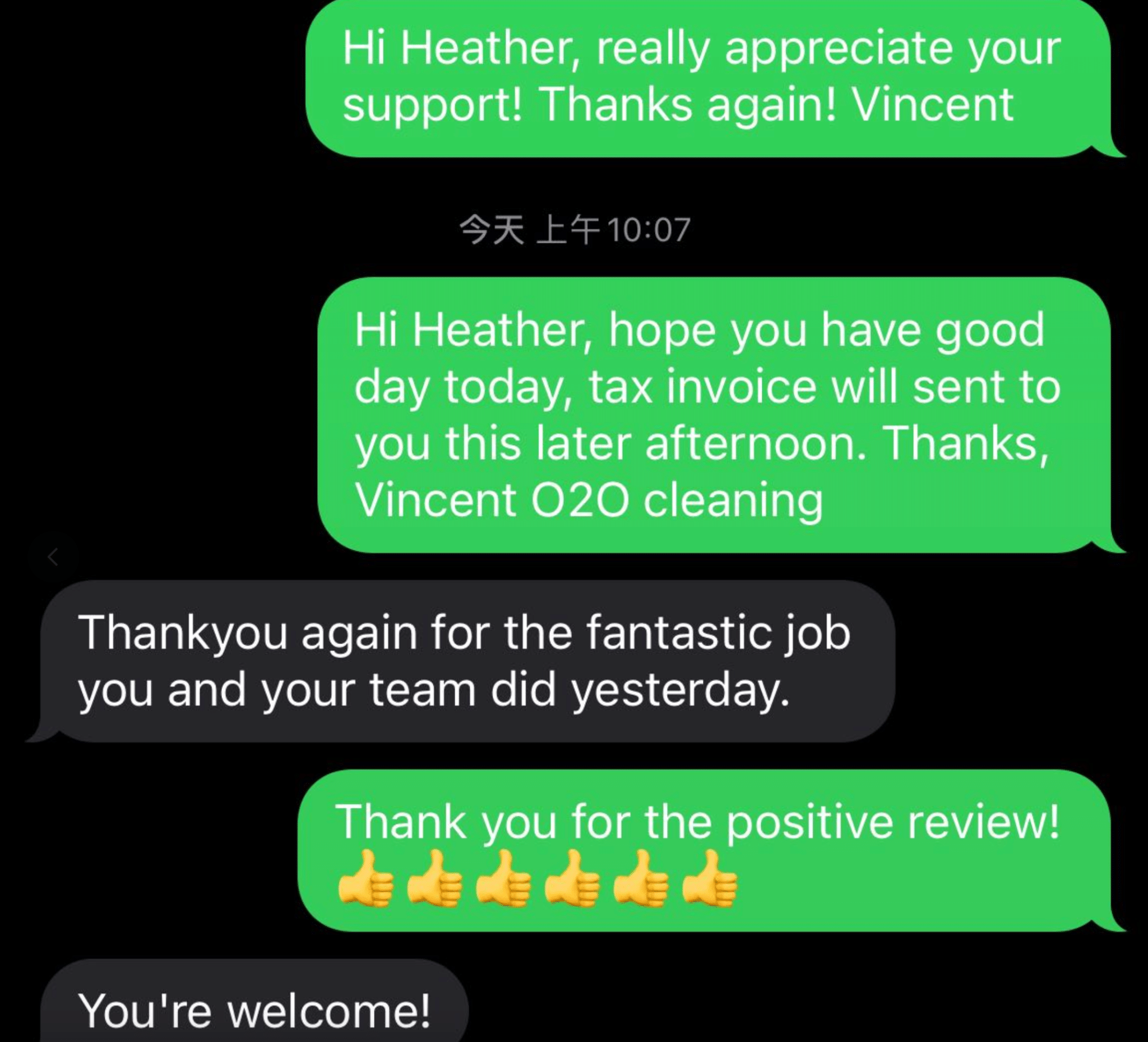 • After-Service Interaction: Once the cleaning was completed, Heather received a follow-up message thanking her for her business and inviting her to leave a review. The team also inquired if there was anything else they could assist with, demonstrating their commitment to customer satisfaction.