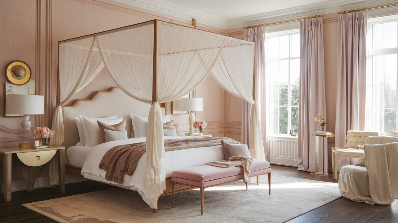 A full four-poster frame draped with fabric creates the most impact, but simpler options like a crown canopy mounted on the wall above the headboard can achieve a similar effect with less visual weight.