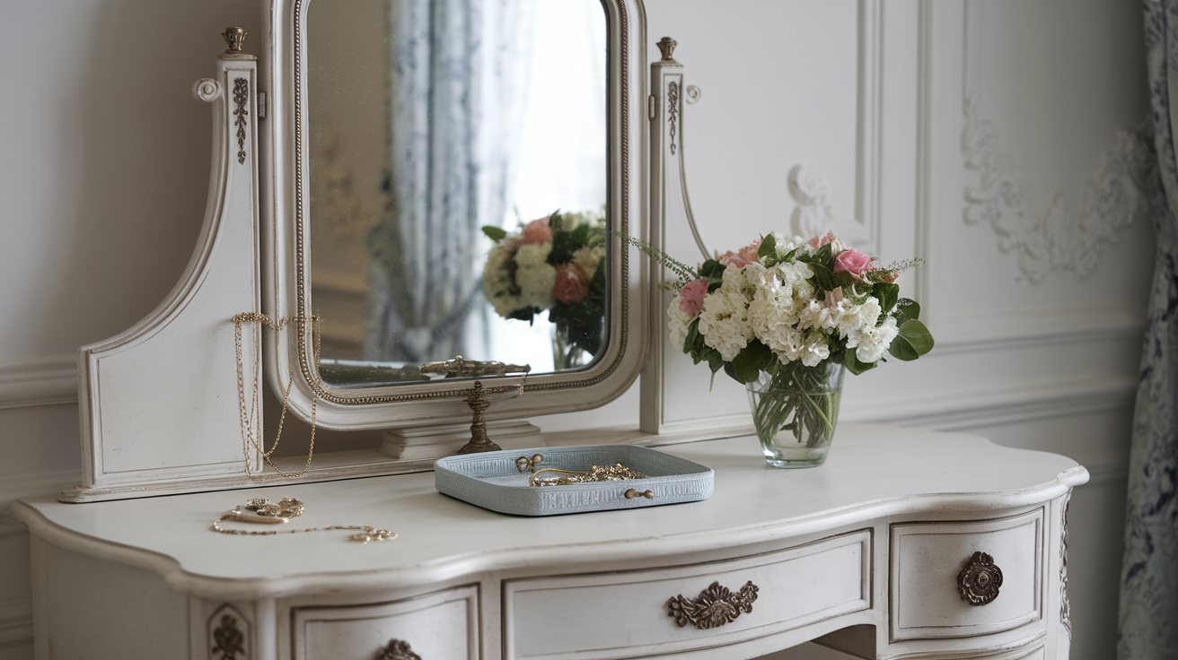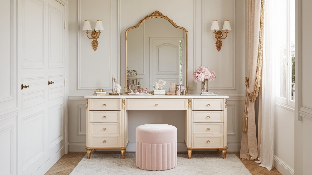 A French-style vanity or dressing table with fine carvings and a classic mirror adds both function and charm to your bedroom, improving the romantic atmosphere.