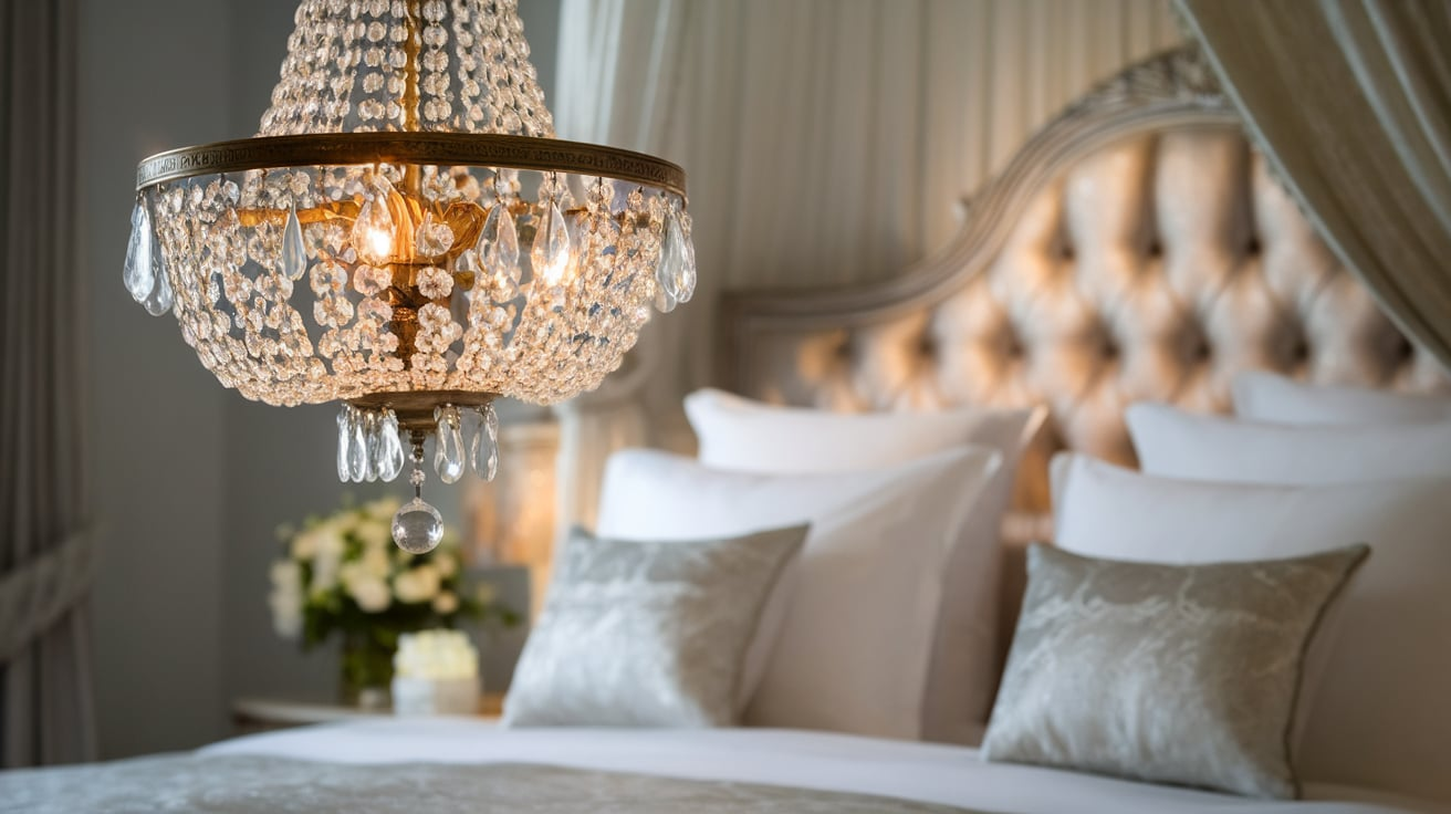 Install a vintage-style chandelier with crystals or wrought iron to provide a warm, romantic glow. The sparkling lights will enhance the luxurious and cozy atmosphere of your bedroom.