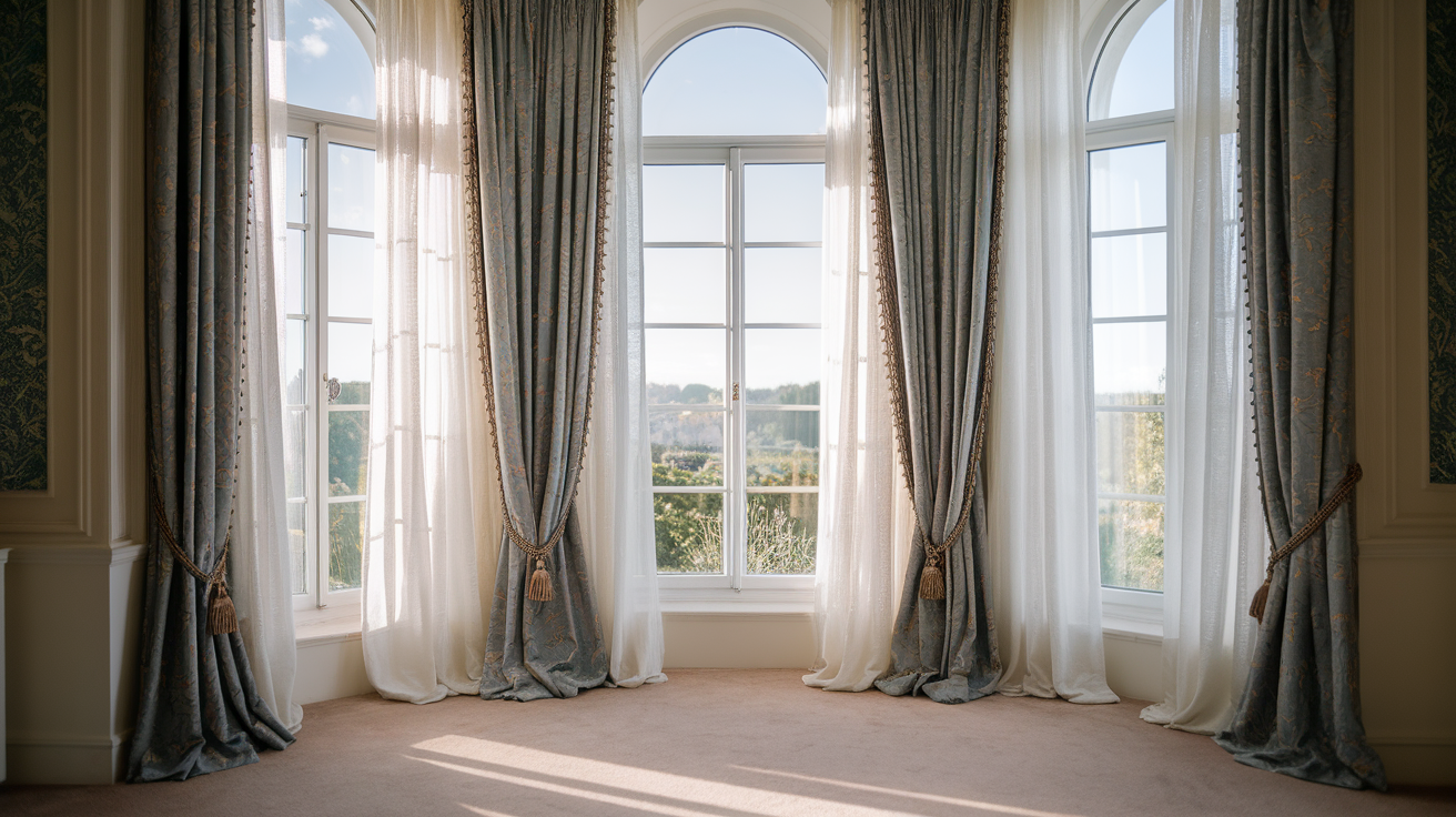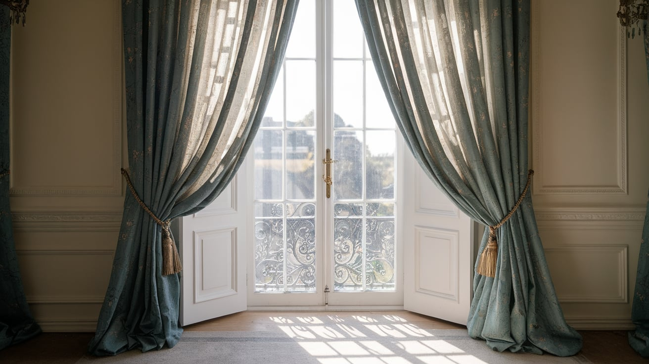 For a true French look, choose drapes with simple ties or holdbacks rather than stiff pleats. Fabrics like linen, cotton, or silk blend move beautifully in the breeze and filter light in a flattering way.
