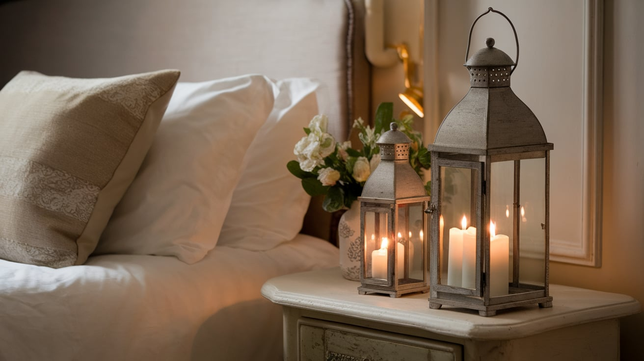 Add French country lanterns for soft, background lighting. The rustic lanterns create a warm, close atmosphere that complements the romantic style of the room.