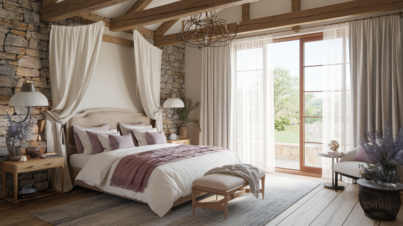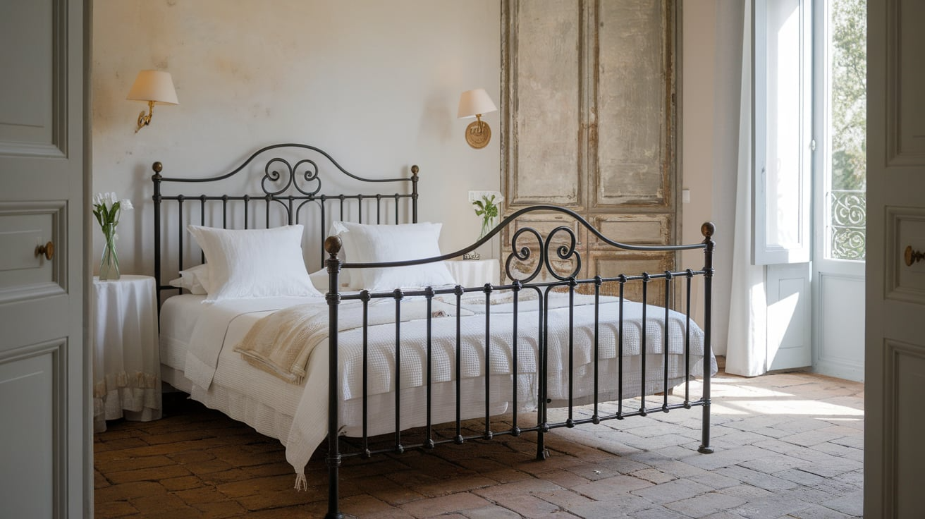 Add touches of wrought iron in light fixtures or bed frames. Small details like dried lavender bundles, woven baskets, or ceramic pitchers bring authentic French country charm to your bedroom.