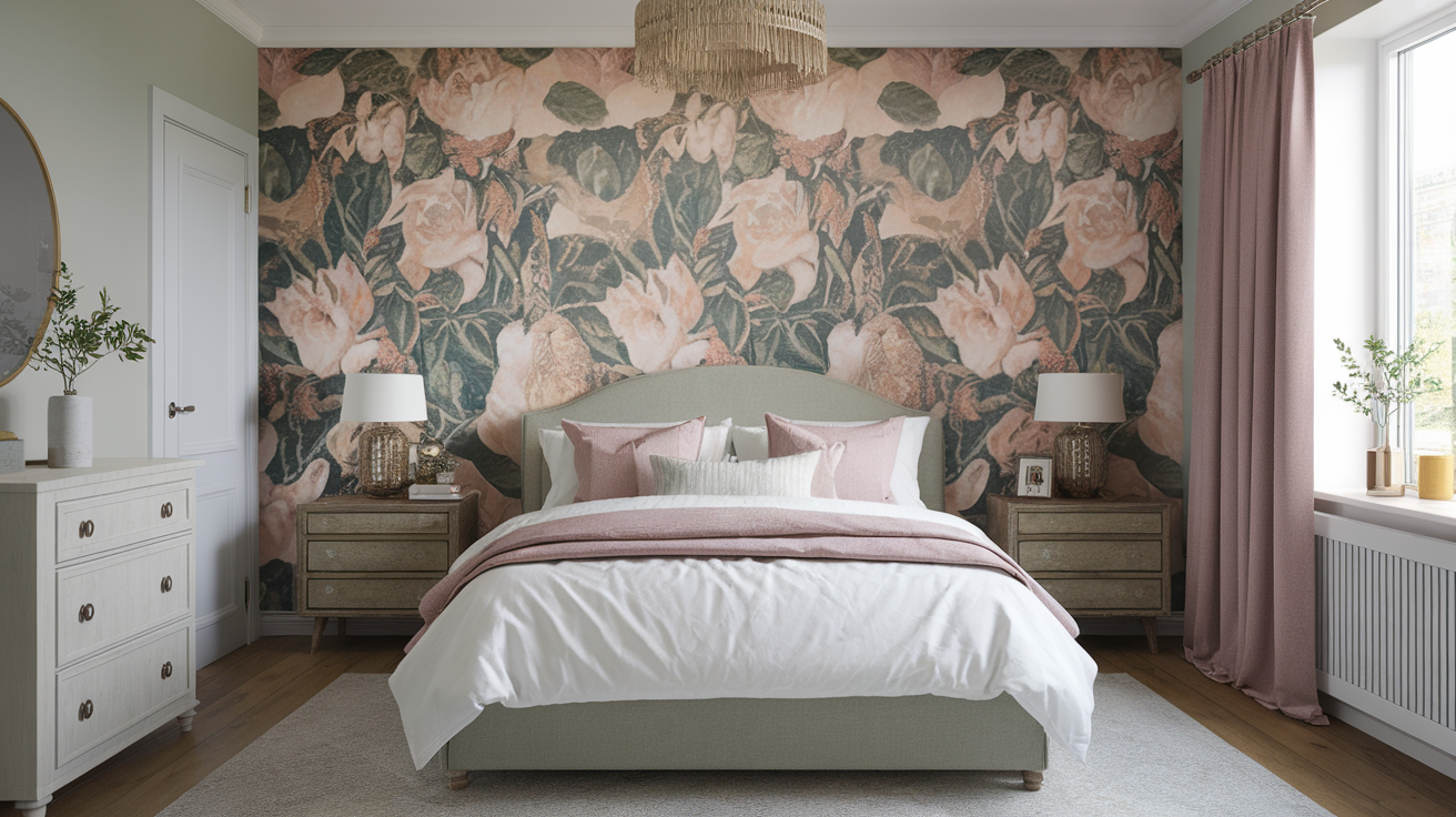 The best wall for this treatment is typically behind the headboard, creating a focal point. Look for patterns that include roses, lavender, or small field flowers in muted tones.
