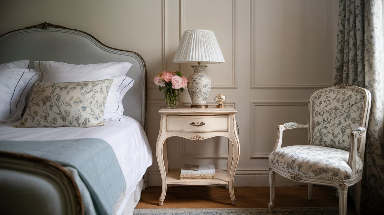 Add stylish, vintage-style bedside tables with detailed carvings and a slightly worn finish. These tables bring both function and style to your French-inspired bedroom.
