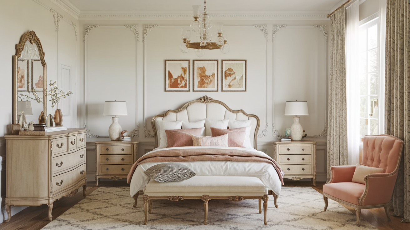 Start with soft pastel shades like blush pinks, lavender, and light cream to create a calm and romantic base for your French-inspired bedroom. These colors stand the test of time and create a feeling of peace and style.