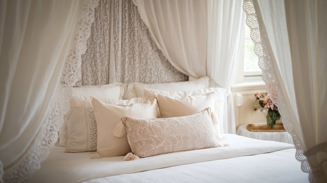 Add lace details to your bedding, curtains, or pillows. The detailed patterns create a refined and light touch, perfect for a romantic atmosphere.