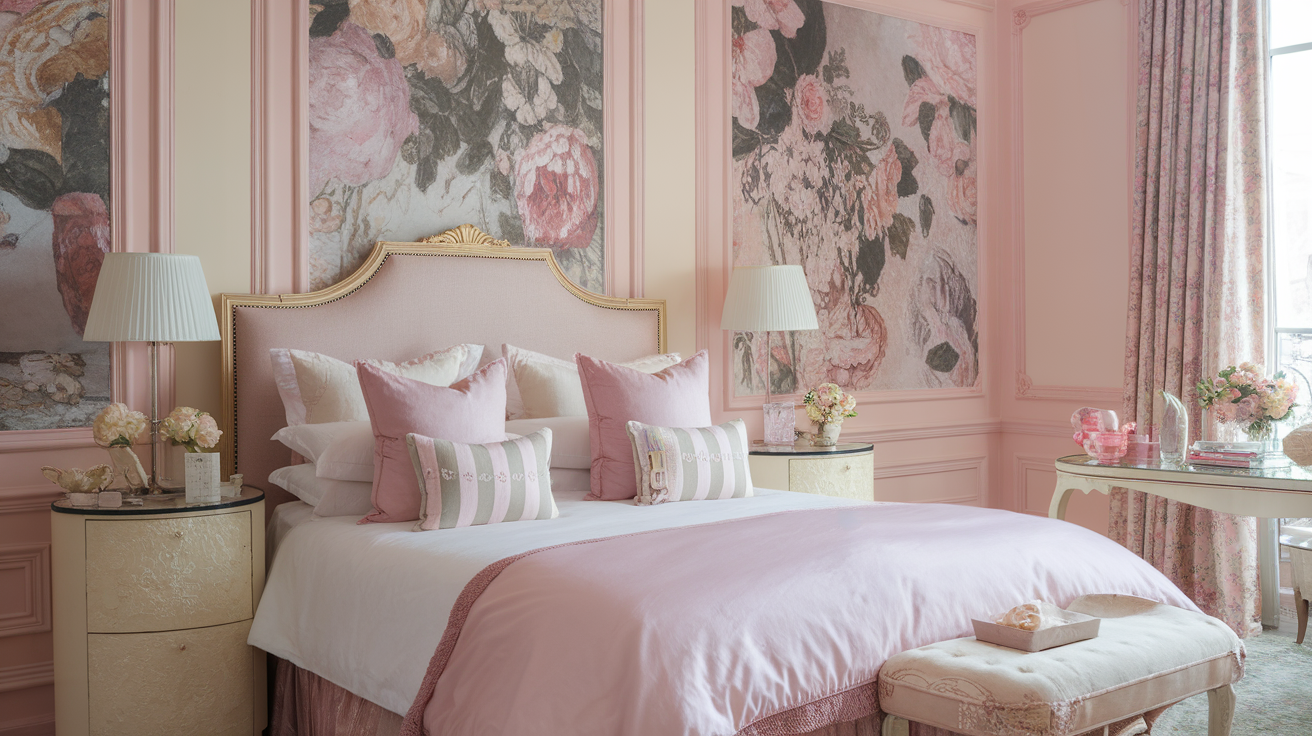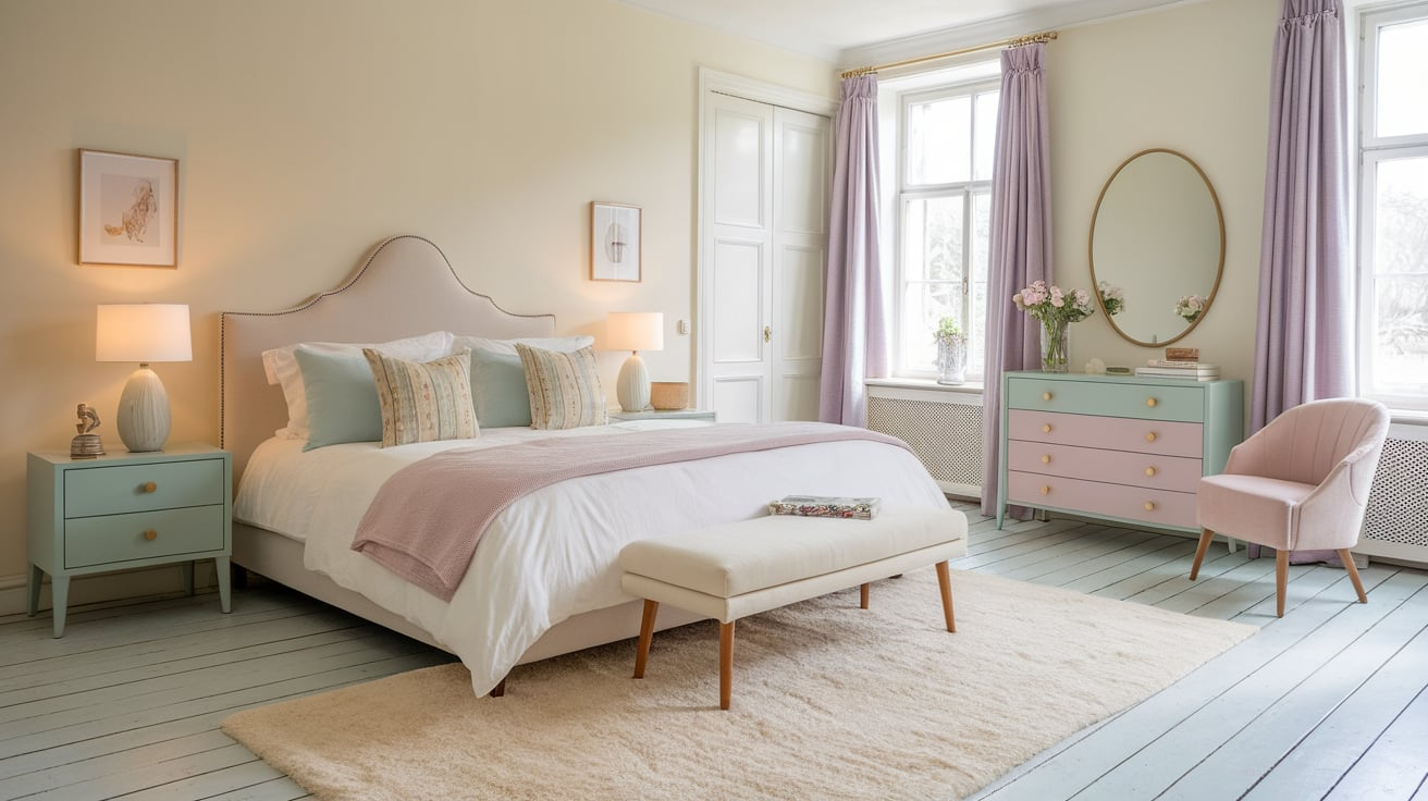 Think of gentle whites, light blues, and subtle pinks that remind you of a morning in Paris. These light shades help make the room feel bigger and more peaceful.