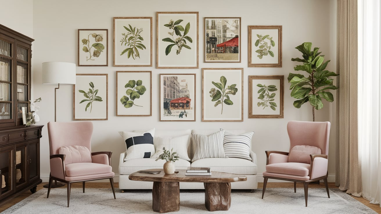 Add French-inspired art to the walls, such as vintage prints, plant illustrations, or Paris street scenes. Frame them in gold or weathered frames to complete the look.
