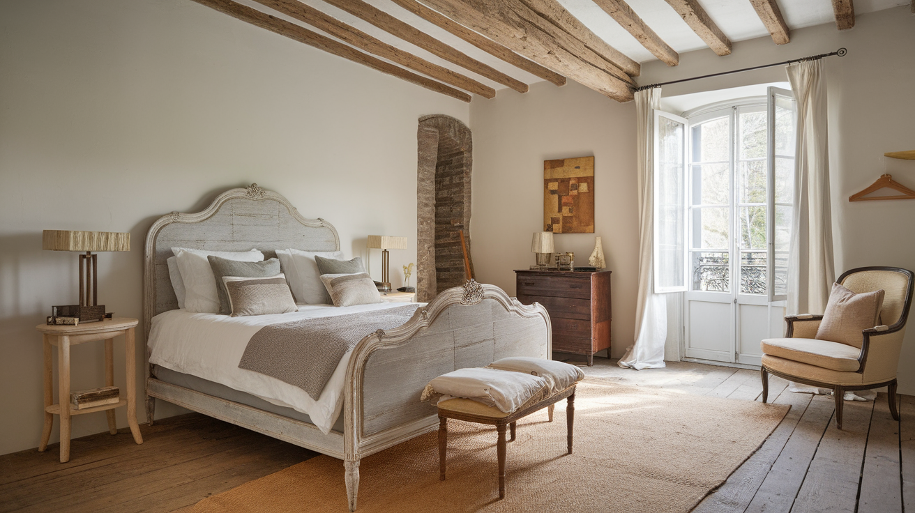 Look for furniture with a lived-in feel—slightly worn edges, a bit of patina, or a hand-finished quality. A wooden bench at the foot of the bed, a simple side table, or exposed ceiling beams can all bring natural warmth to the space.