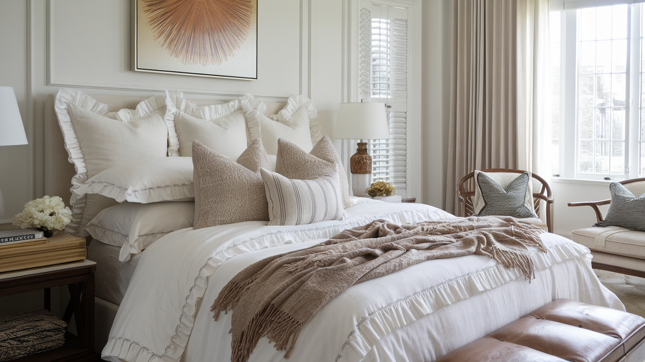 Layer different textures and weights for visual interest and comfort in all seasons. The bed should look full and welcoming, with plenty of pillows and perhaps a light throw blanket casually placed at the foot.