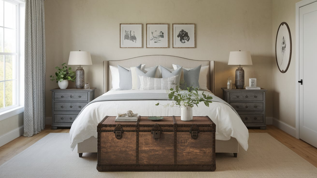 Use old-style French trunks at the foot of your bed for both storage and a decorative touch. These trunks add character and serve as a practical yet stylish addition to your room. Look for pieces with leather straps, metal corners, or interesting locks and hardware.