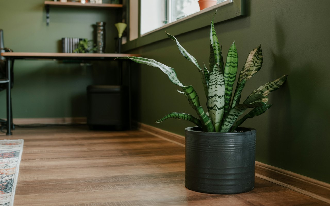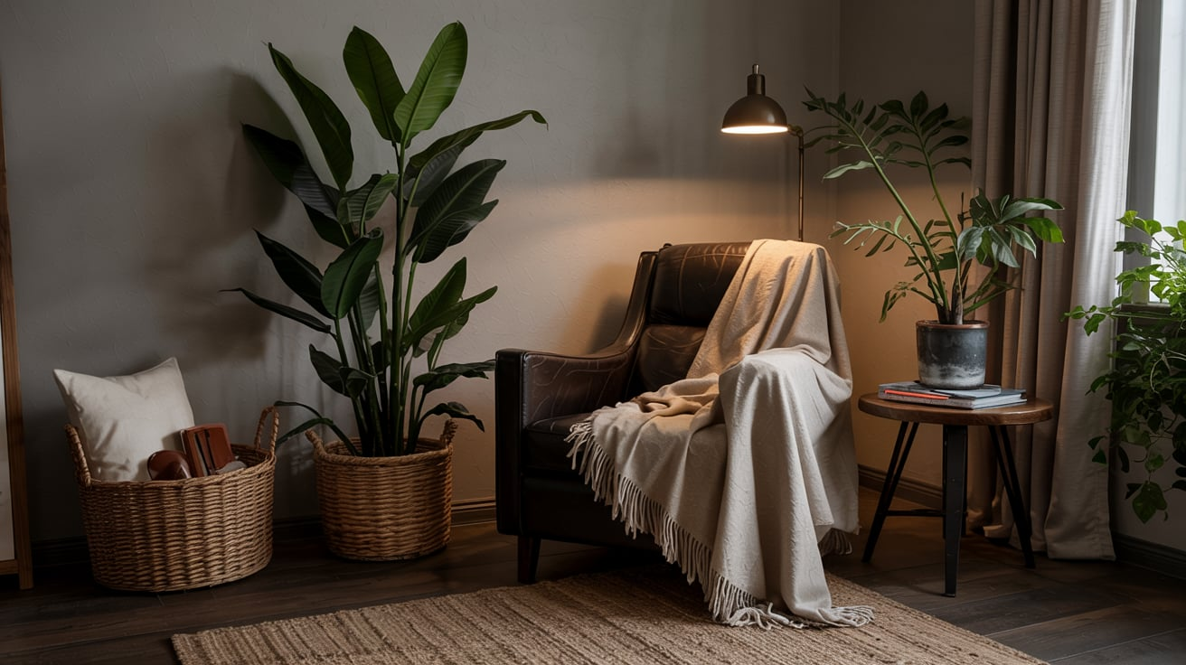 Plants help soften the space while adding a quiet bit of color. Choose ones with wider, dark leaves to match the room’s tone. Please place them in opposite corners or near the window.