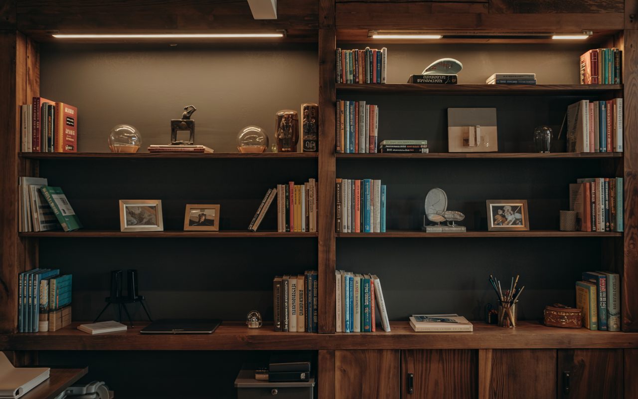 Shelf lighting can turn basic storage into a feature. Stick-on strips are easy to use and don’t need complex tools. Place them near the top edge of a shelf to highlight books, art, or keepsakes.