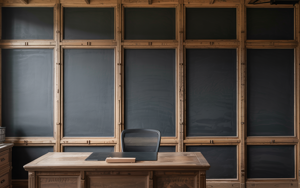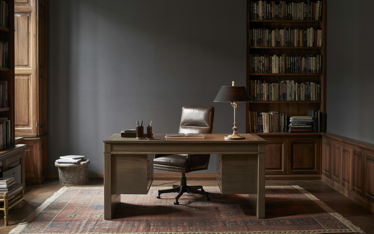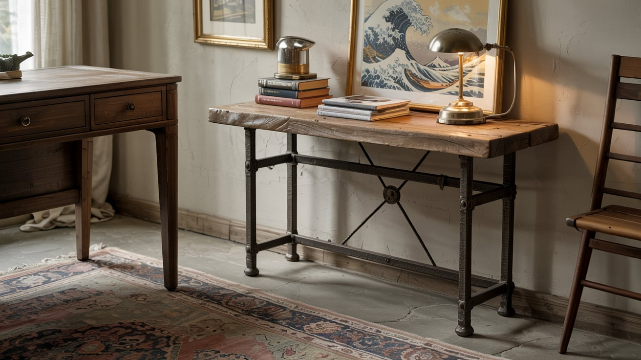 - Desk: Choose a desk with weight and structure—think thick surfaces and clean lines in wood or metal.