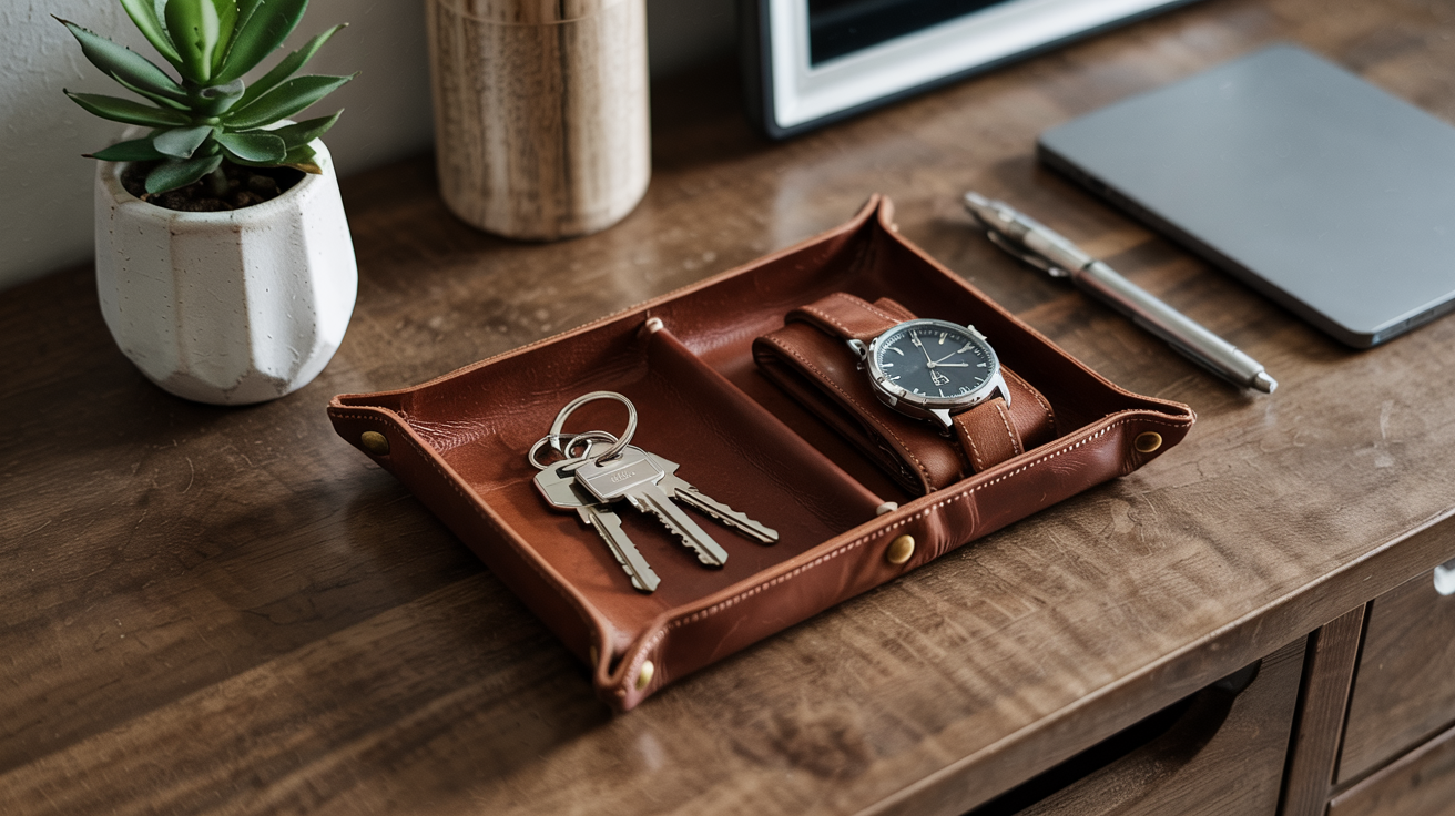 A tray can hold everyday items like pens, wallets, or earbuds. It can be placed on the desk, shelf, or console.