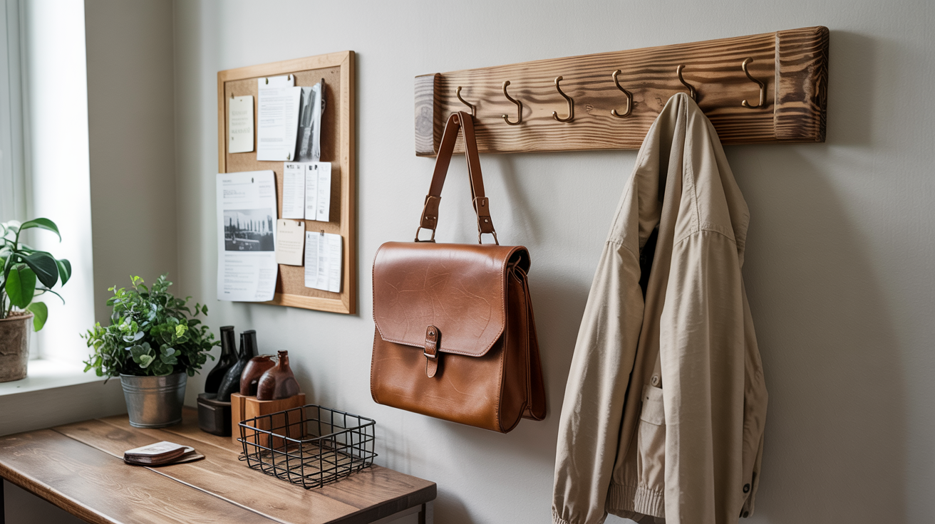 Install metal or wood hooks on a board for coats, bags, or headphones. This will add function to an empty wall and keep items off the floor.