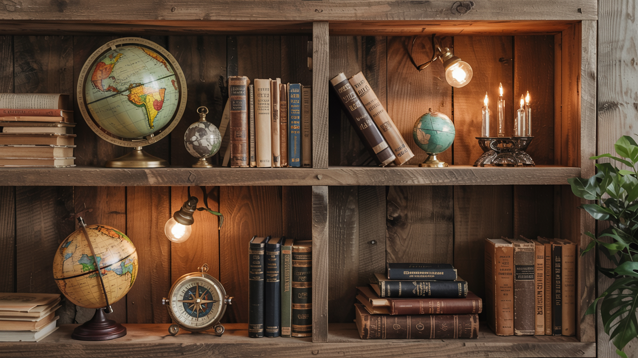 Add one large piece, like a globe or compass, to a shelf or table. Stick to aged finishes, brushed metal, or wood bases that work best.