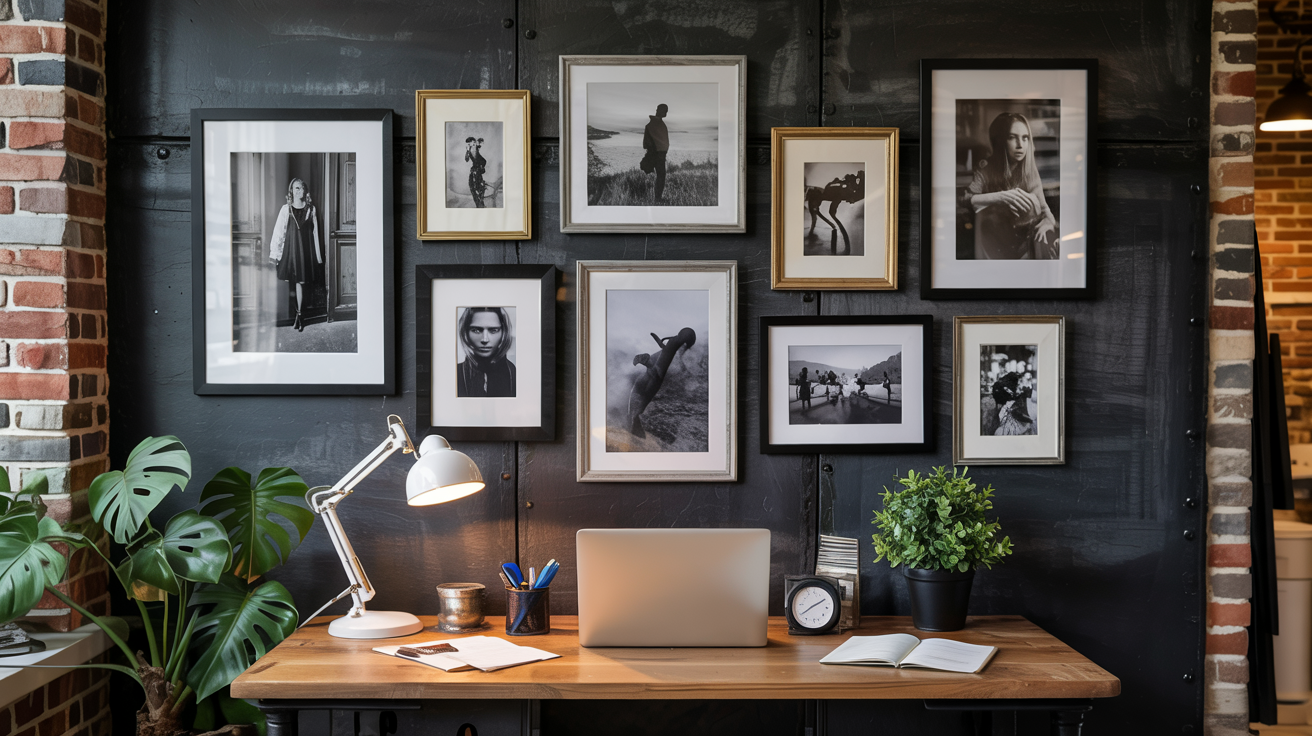 Monochrome prints in black or dark wood frames add mood and focus. Use clean lines and large matting to avoid visual clutter.