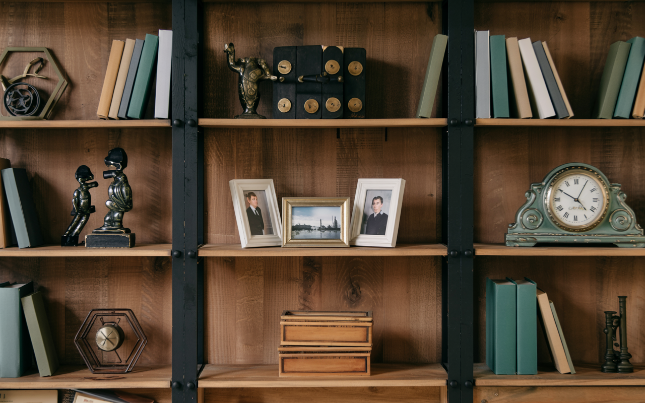 Choose books in deep tones that match the room’s color scheme. Group them by height or theme to keep shelves looking neat.