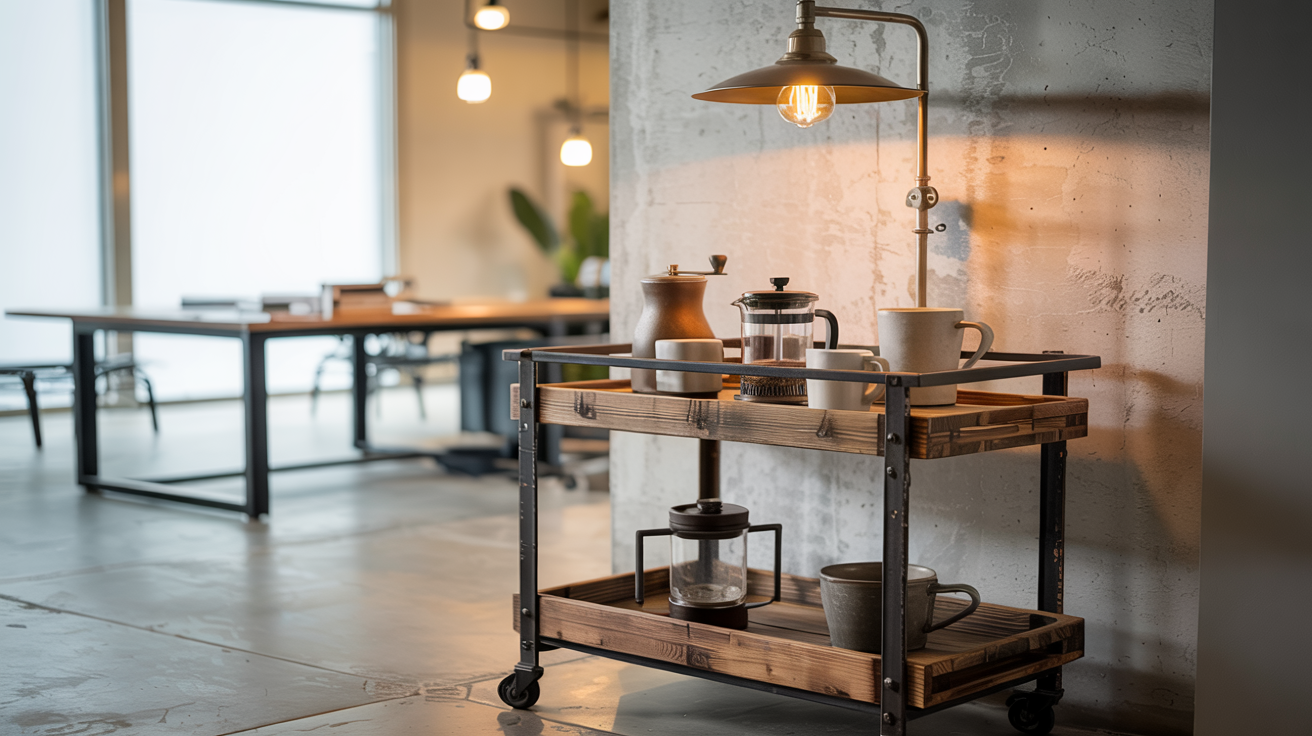 Use a small rolling cart made of wood or metal to hold drinks, cups, or supplies. Place it near the desk or sofa for easy access during breaks.