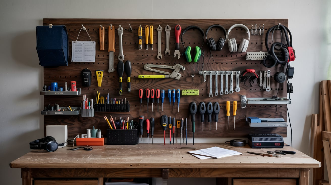 Install a dark-toned pegboard for hanging items like cables or hand tools. It keeps items off the desk and groups them by function.