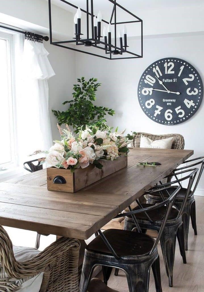 You can combine the wooden dining table, metal chandelier, iron chairs, etc., to elevate the beauty of the space. The whole idea, when collected together, will never disappoint to add a strong styling statement to your farmhouse. To make the place look more vibrant and charming, you can use colorful curtains, flowers, clock accessories, etc.