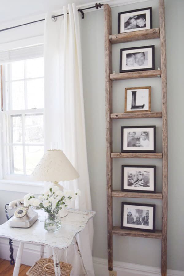You can use an antique ladder to display the pictures of your loved ones and family members on the living room wall. Add a unique center table with some beautiful flowers to add a distinguished charm to the space.