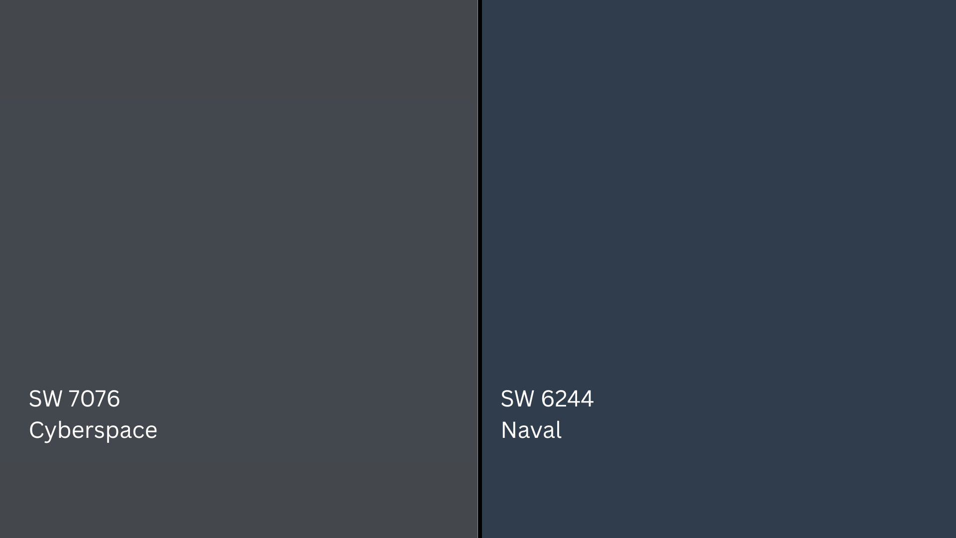 Naval (SW 6244,HEX #2F3D4C) is brighter and more traditional in tone than navy. It leans less gray than Cyberspace and has a higher LRV of 4. Cyberspace feels more grounded and modern.