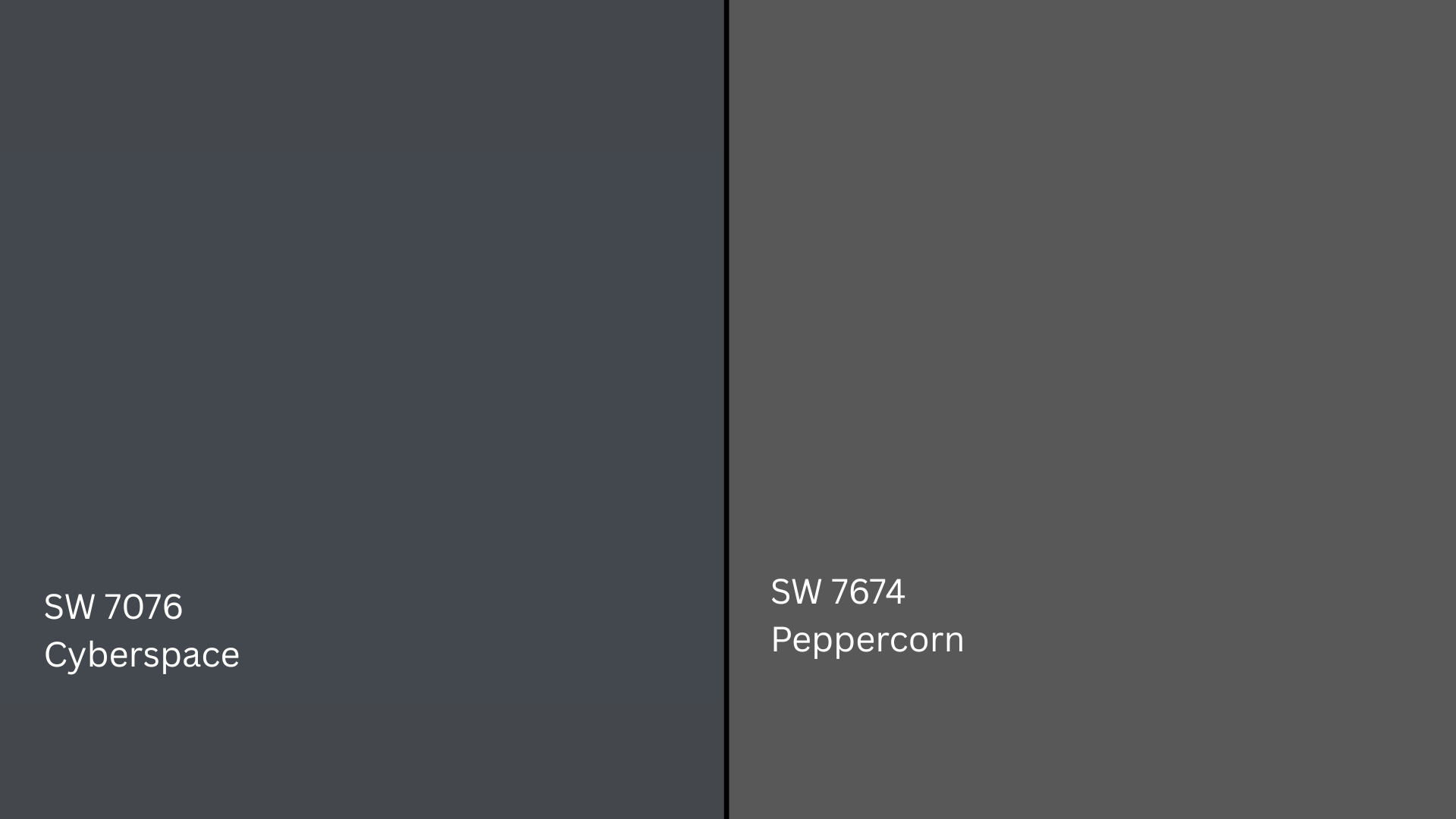 Peppercorn (SW 7674,HEX #585858) leans more gray with a subtle brown undertone, making it warmer overall. Cyberspace reads cooler, with a distinct blue base and smoky depth.