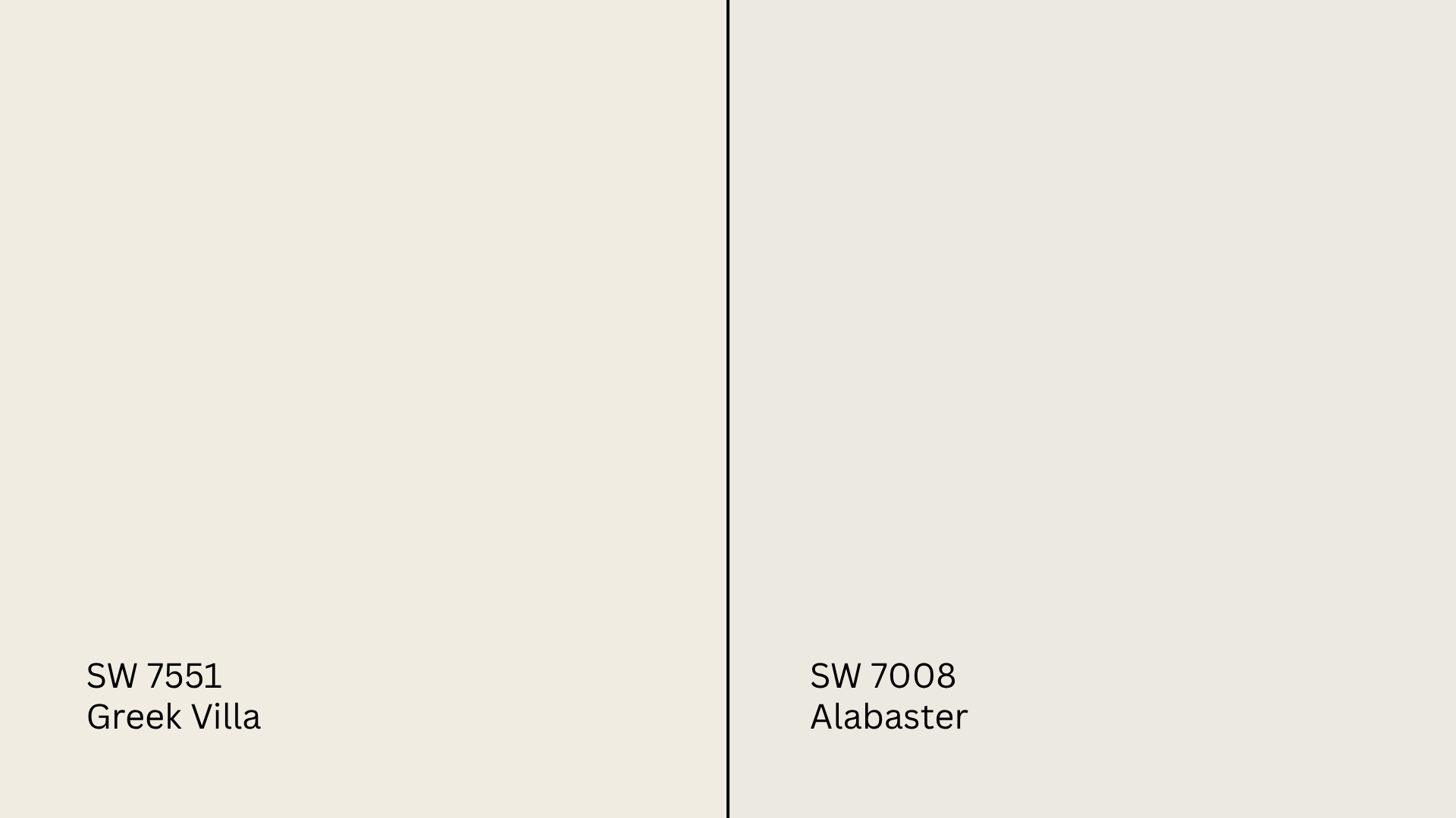 Choose Alabaster if you want a neutral, grounded white. Go with Greek Villa if you want something warmer and brighter.