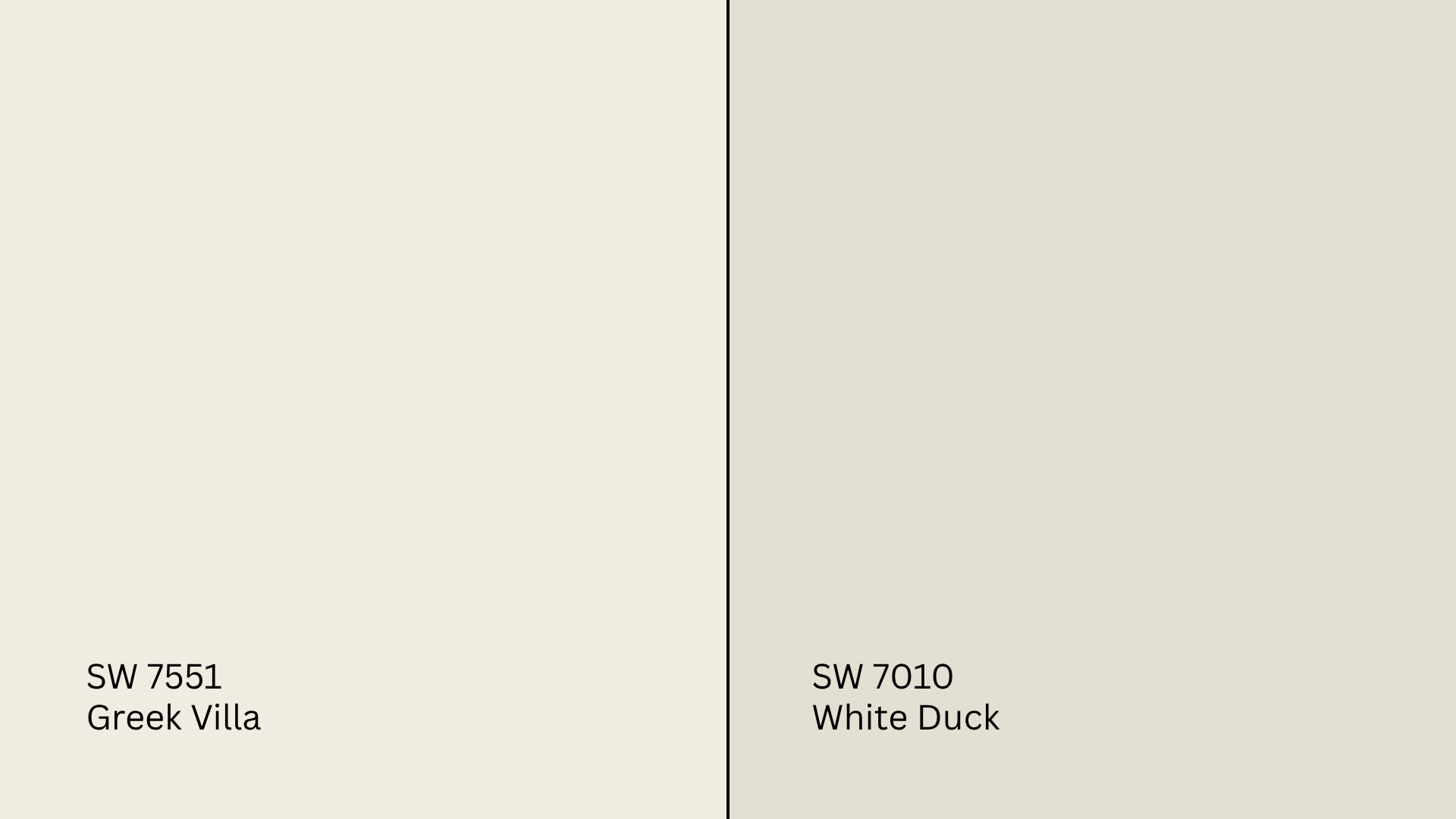 White Duck (SW 7010, #EDE8DC) leans greige and has more depth. It works well for cozy interiors.
