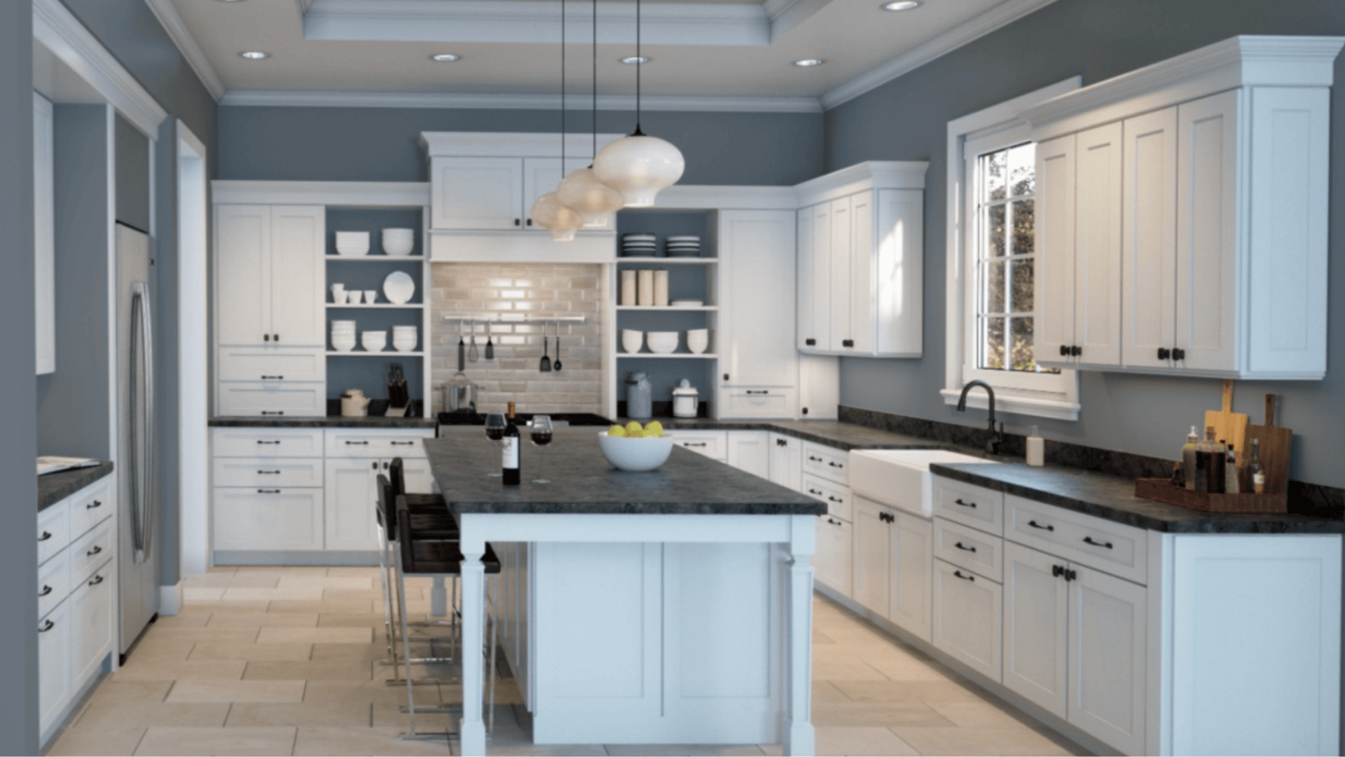 Storm Cloud adds depth and drama in kitchens. It’s perfect for lower cabinets or full walls when paired with white counters and brass or chrome hardware. Just be aware—it will absorb light, so it works best in well-lit kitchens.