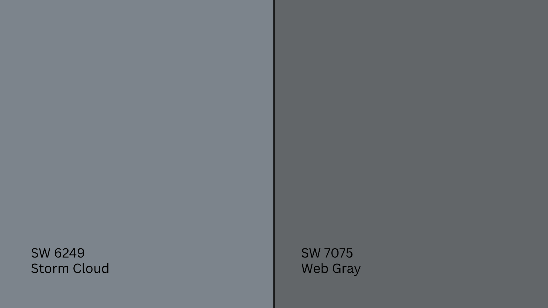 Web Gray (SW 7075, #616669) is a darker, more neutral gray with less blue than Storm Cloud.
