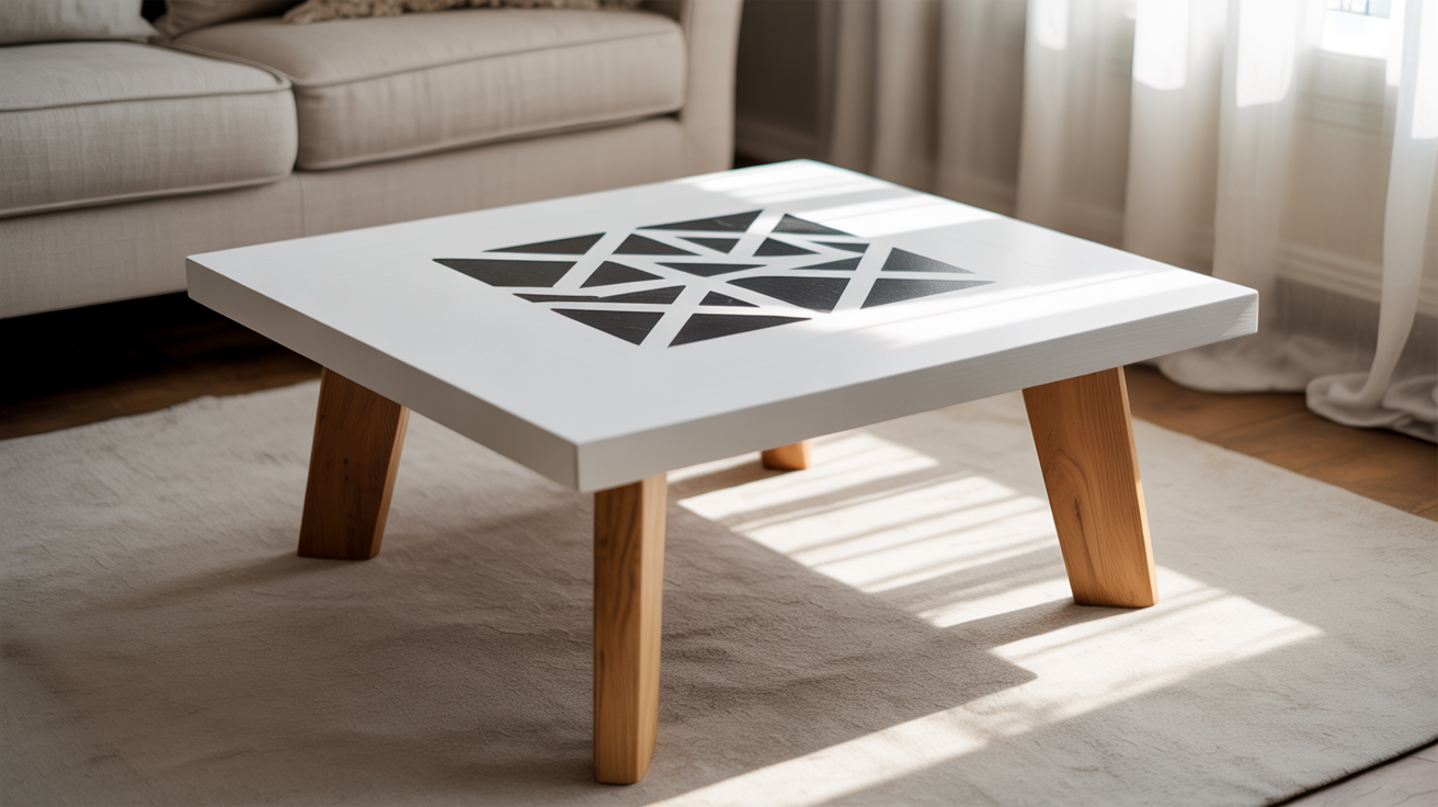 This table was sanded and painted white, then topped with a bold stencil design for visual interest. The legs were left plain to keep focus on the top.