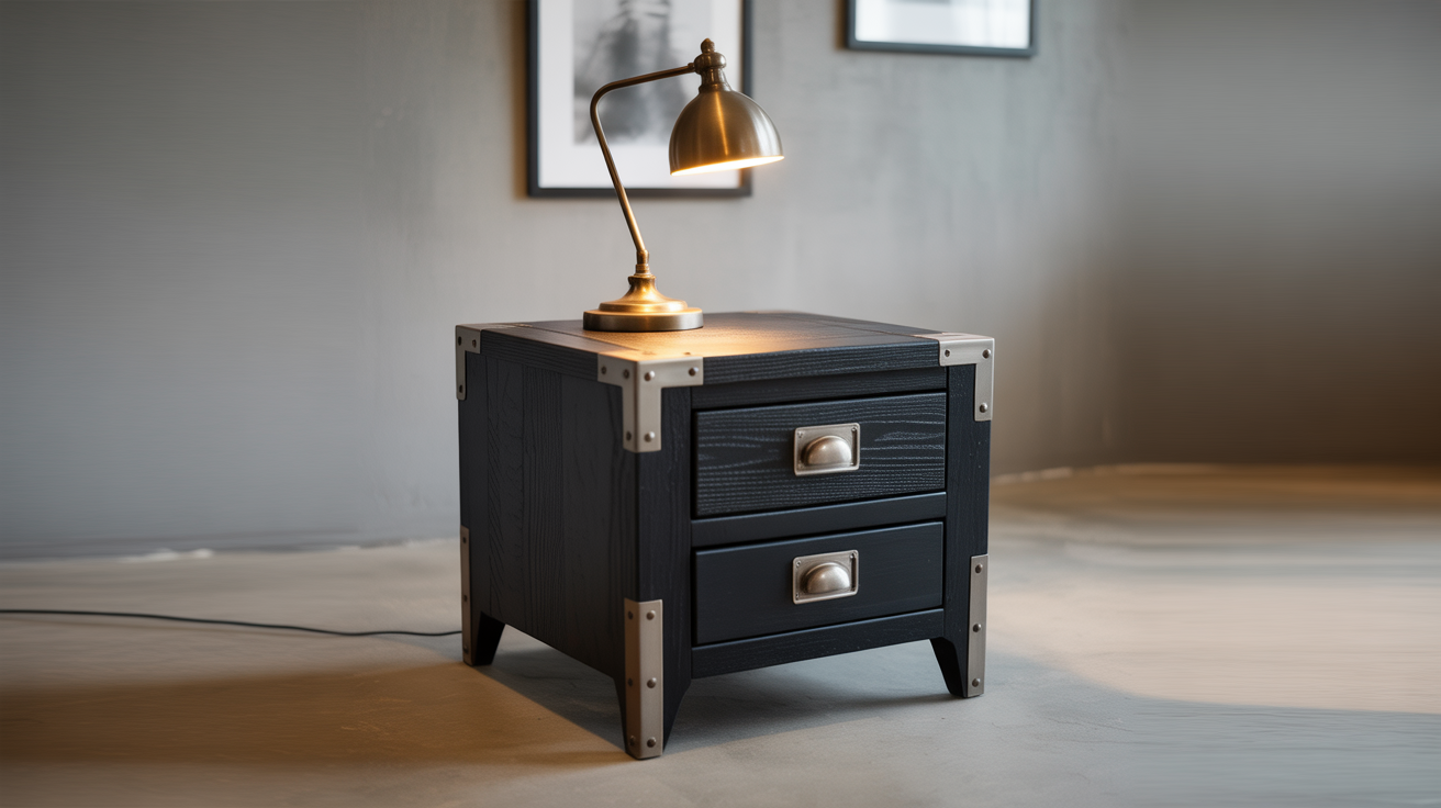 The end table was sanded and painted matte black. Corner brackets and brushed steel drawer pulls were added using basic screws and a drill. These small hardware upgrades gave the piece a clean, slightly industrial look.