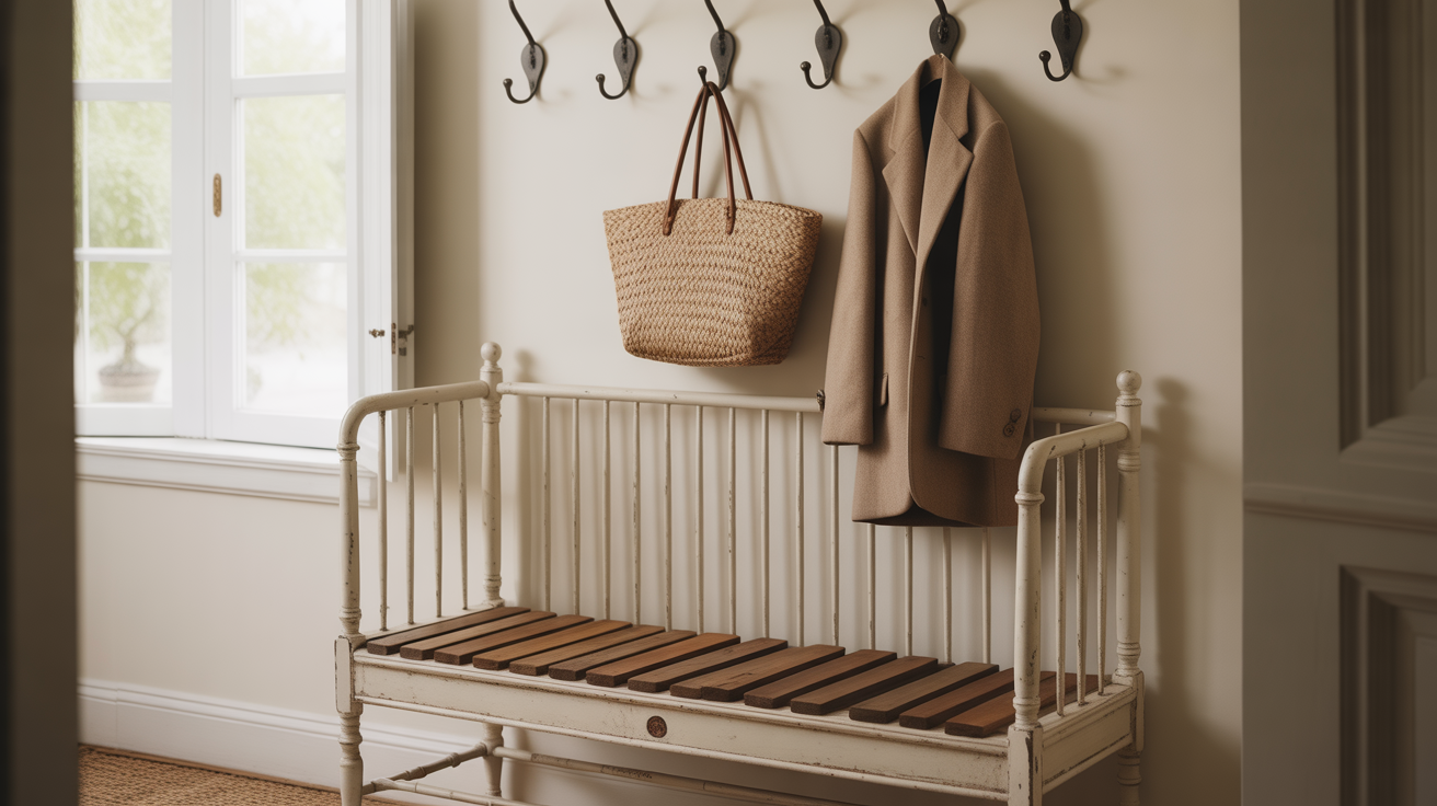 An old crib was disassembled, and the side rails were reused as the back and arms of a bench. A new seat was added using cut slats, then the whole piece was painted. Hooks were installed above to finish the hallway setup.