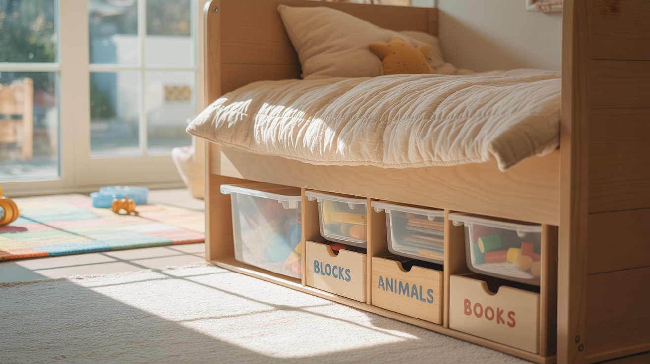 Shallow rolling containers slide easily beneath beds, providing hidden storage for seasonal items or less-used toys. Clear bins make contents visible, helping children find what they need independently.
