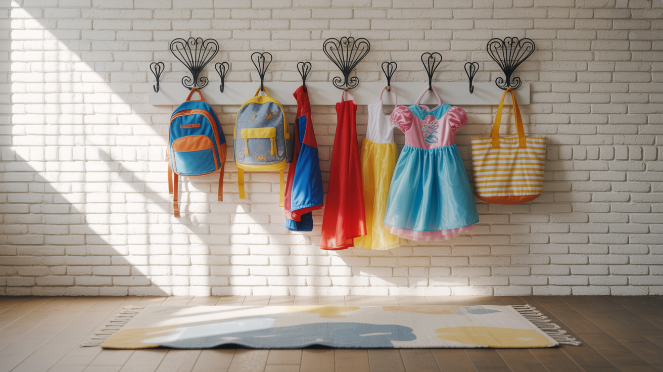 Install hooks at child-friendly heights to encourage independence in hanging up their own belongings. Group hooks by function—dress-up items on one wall, daily use bags on another—for intuitive organization.