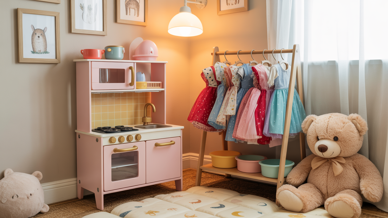 Add a small basket of props nearby (microphones, simple costumes, and musical instruments) to inspire performances. This multi-purpose zone becomes a creativity hub that adapts to various imaginative scenarios.