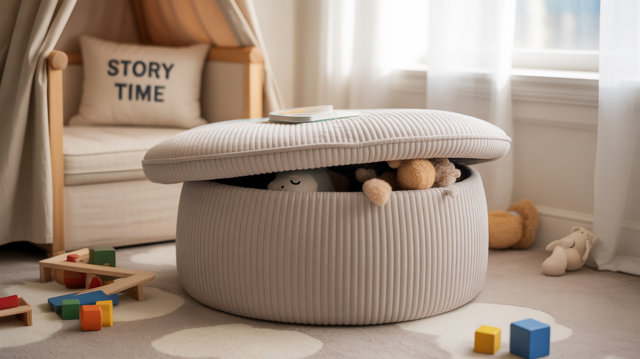 Soft seating options with hidden storage compartments serve multiple functions without visual clutter. These pieces provide comfort during reading time while concealing toys or blankets.