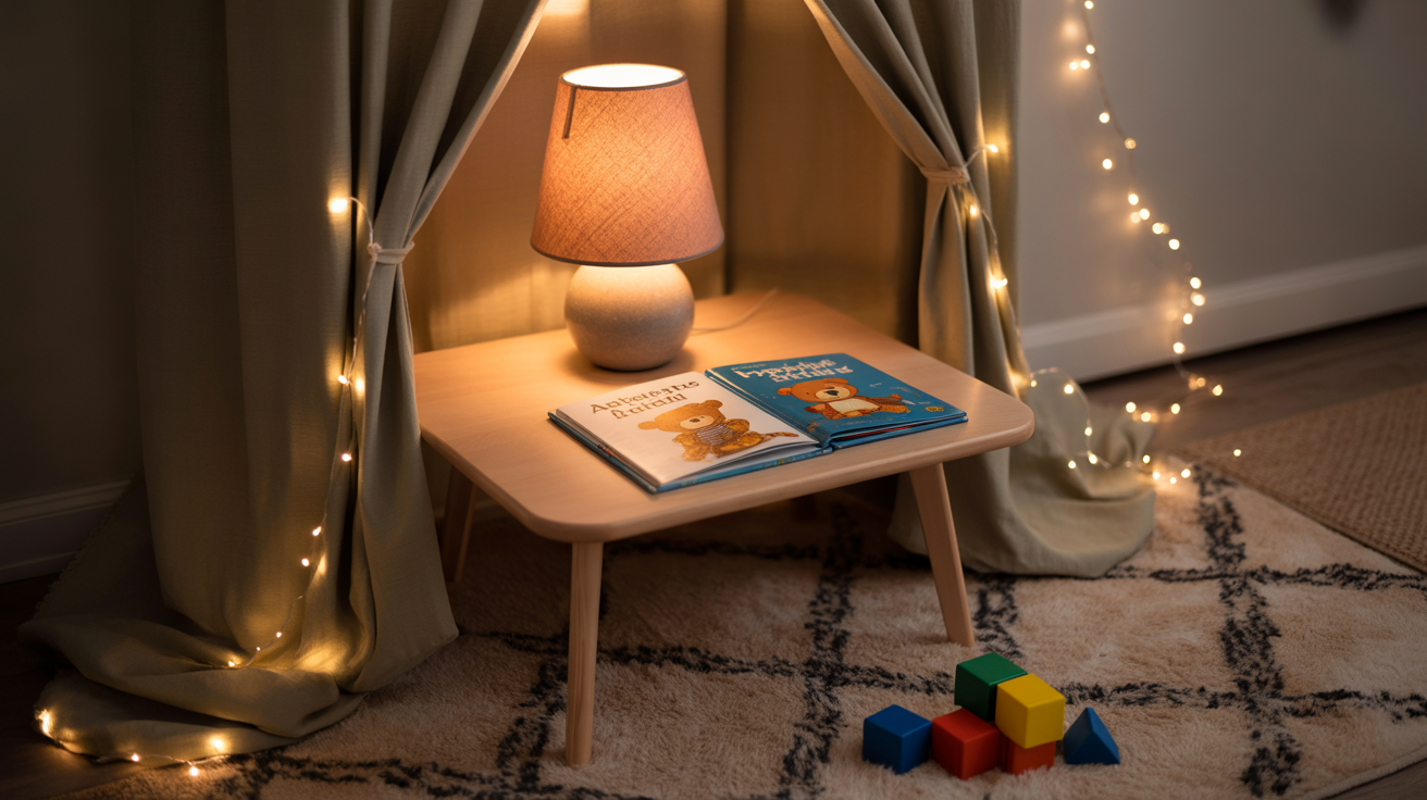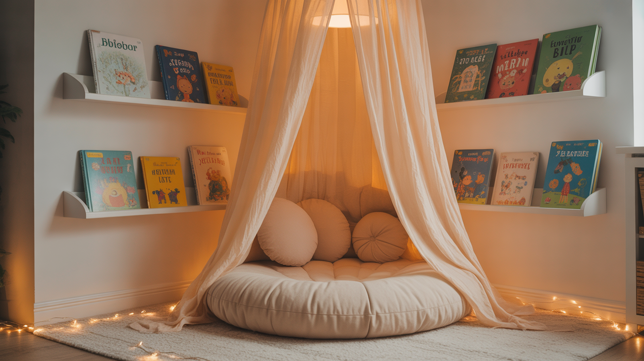 A designated corner with floor pillows and a simple fabric canopy creates a magical retreat for quiet reading. This defined space helps children understand the value of peaceful activities.
