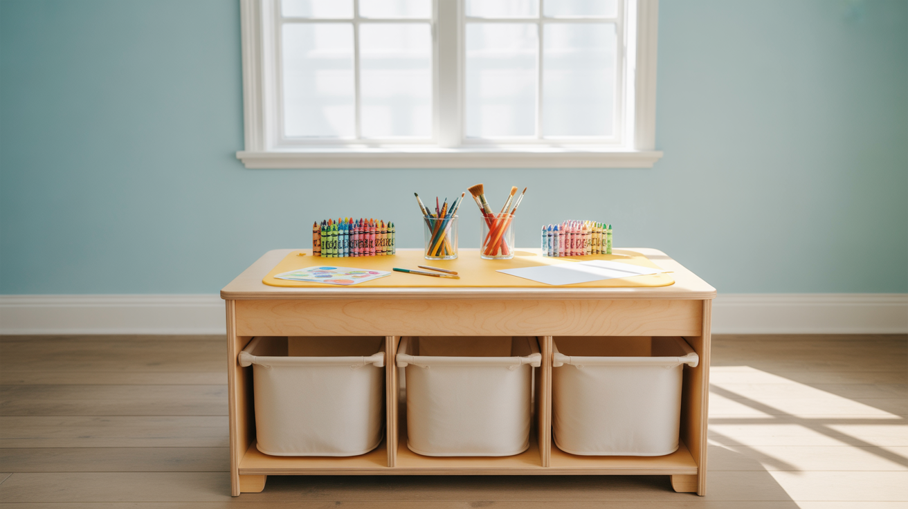 Child-height tables with integrated storage bins or shelves beneath create dedicated creativity zones without wasting space. These dual-purpose pieces encourage independent play while containing mess.