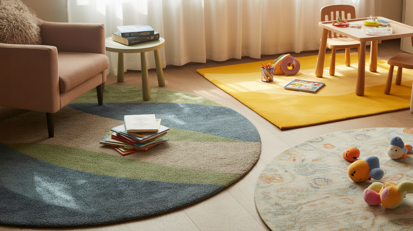 Choose rugs with interesting patterns that can inspire play scenarios, circular rugs become ponds. Secure edges with non-slip backing to prevent tripping hazards.