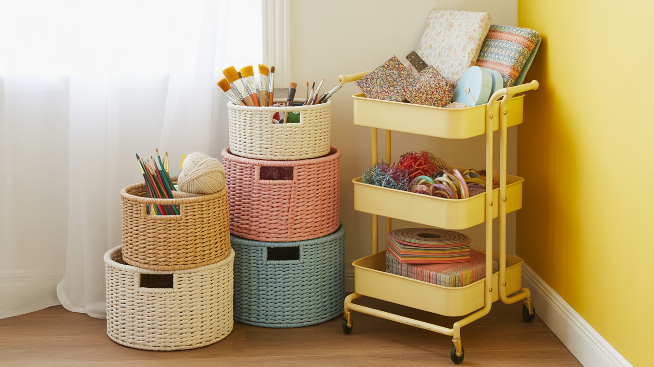 Pegboards or hanging mesh bags maximize vertical space for scissors, markers, and tape. Include a small drying rack or clothesline for displaying finished masterpieces.